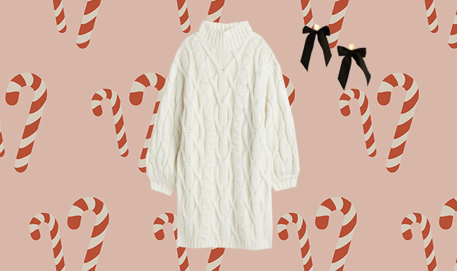 A cable-knit sweater dress is the piece of our dreams, emulating cozy winter vibes while still being chic as all hell. With tights and your go-to black boots and uber-festive bow earrings, it’s a sweet, understated look made for a gift exchange or Christmas morning festivities.