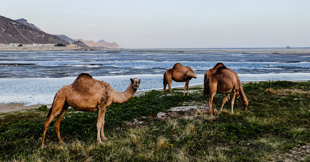At Mughsail Beach, with Mount Qamar looming in the distance, the shallow pools of light green and blue water gathered in pockets in the sand, as dromedaries, or one-humped Arabian camels, walked along the shore, silhouetted by an orange sun. Ropes of a vine called goat’s foot crisscrossed the beach, with their pink flowers dotting the sand.