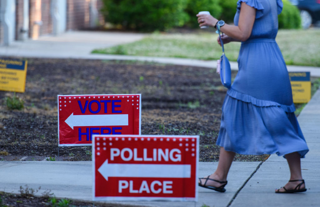 A woman walks into a polling place to cast her ballot in the midterm primary elections on May 17, 2022 in Cary, North Carolina. (Photo by Melissa Sue Gerrits/Getty Images)