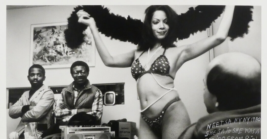 Ferrato explores the pleasures of physical love as well as its occasional costs, bringing her Leica to swingers parties, not just to women’s shelters. Some of these pictures are steamy, but more often they are playful. A dance leader wearing a fishnet dress at a clothing-optional resort juts her butt provocatively, so it dominates Ferrato’s photograph. A smiling exotic dancer clothed in a bikini extends a feathered boa as she performs before an appreciative group of men. “She said she was a Strip-o-Gram girl,” Ferrato writes. “After seeing her work, I say she was a savior the way she moved mankind.”