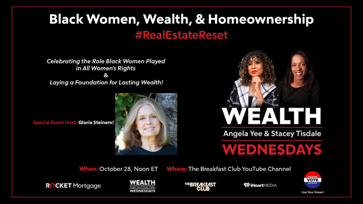 VIRTUAL EVENT! @WealthWednesdays, @AngelaYee and @Stacey Tisdale are bringing you a special edition of #RealEstateReset!. We are celebrating black women and aiming to make more of them homeowners with special guest host @GloriaSteinem! Who ‘takes us to school’ on the role black women played in all women’s rights!. Experts also discuss: How to navigate your career on the road to homeownership; Why more black women are using online mortgage lenders, and more! The show airs October 28th at 12pm on the @Breakfastclubam YouTube! Click https://youtu.be/jHfn5B9sX0U to sign up for the countdown clock and to watch!