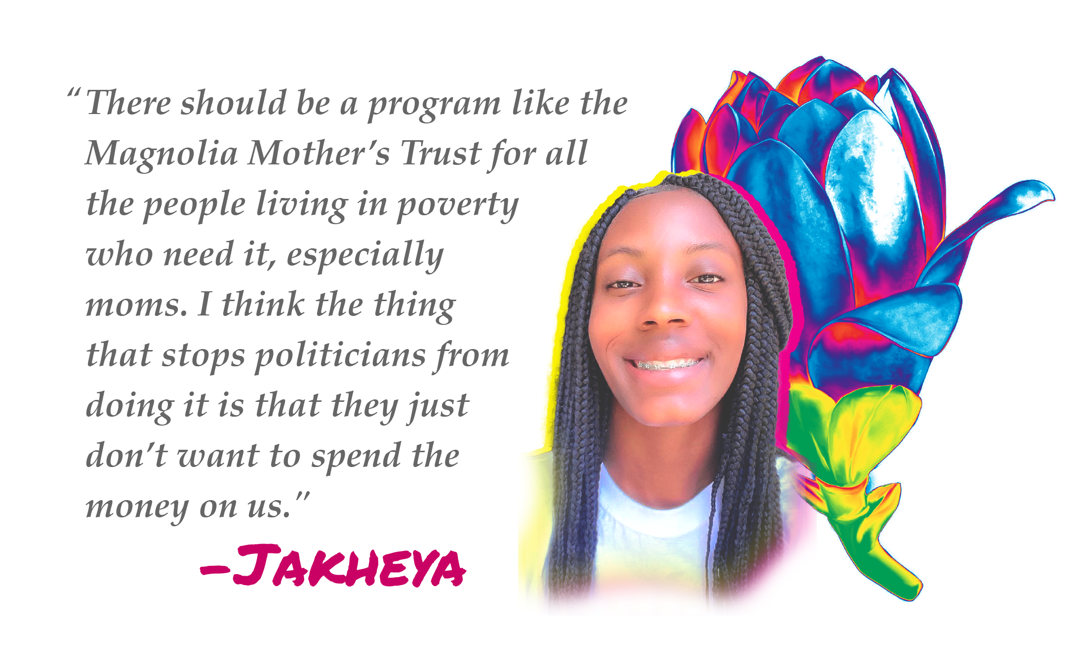 I really believe that there should be a program like the Magnolia Mother’s Trust for all the people living in poverty who need it, especially moms. There is just so much need out here. I think the thing that stops the politicians from doing it is that they just don’t want to spend the money on us.
