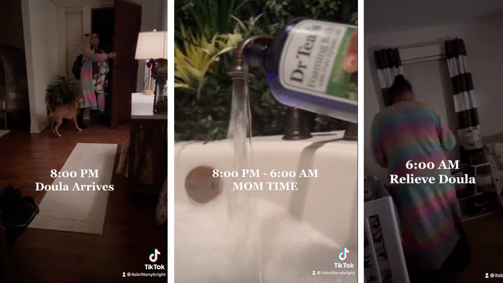 So I was very confused when social media influencer Brittany Bright posted a video on Twitter. She showed how she gets her newborn baby ready for bed, sets out bottles of breastmilk for her night doula, and heads off to her bedroom at 8 p.m. to sleep until 6 a.m. Bright designated this period as Mom Time, which included a bubble bath.