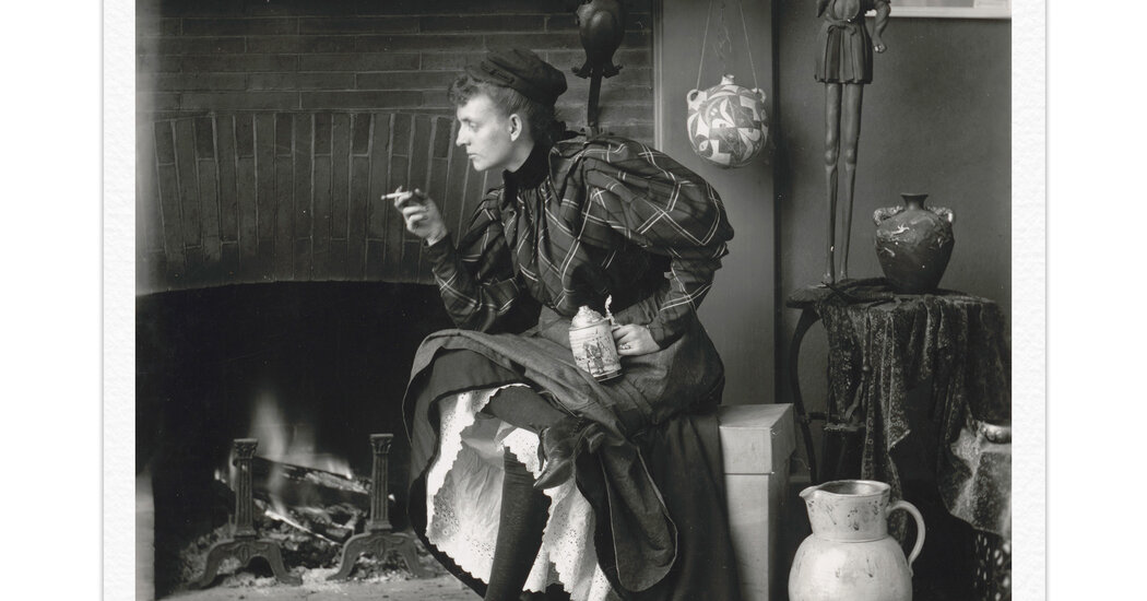 Undaunted by obstacles faced by others of her gender and happy to rattle the easily shocked, she demonstrated her character early on with an 1896 self-portrait titled “The New Woman,” in which she sits in profile beside a fireplace, her dress hiked up to reveal a ribbon of petticoat. In her right hand is a cigarette, in her left a beer stein. For an even brassier self-portrait, she assumed a head-to-toe male persona, complete with mustache and trousers.