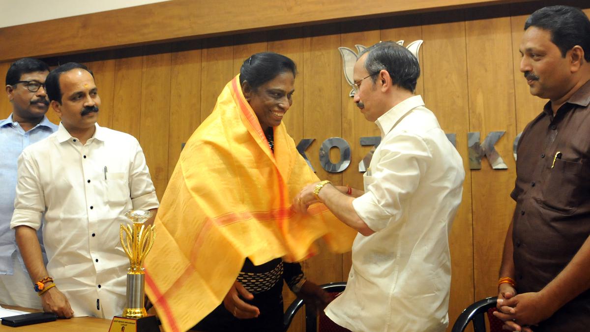 Bharatiya Janata Party State General Secretary M.T. Ramesh honouring P.T. Usha for being elected as the President of the Indian Olympic Association at a civic reception in Kozhikode.