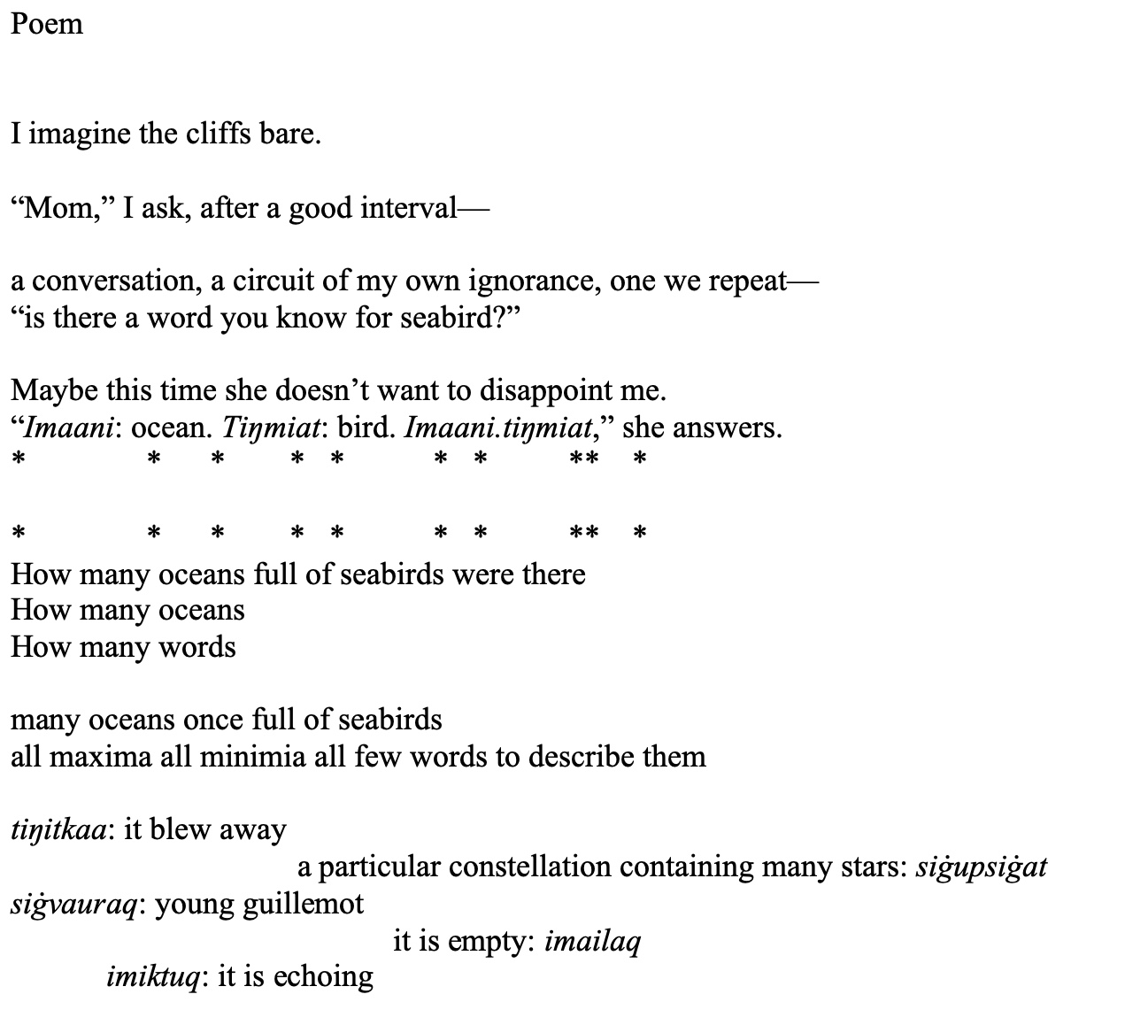 I wrote this poem while composing an essay for Shapes of Native Nonfiction, an anthology just out from the University of Washington Press. The essay does a couple of things, among them making distinctions between two types of traditional stories in the Ugiuvak (King Island) tradition. The poem concerns itself with vacancies of several kinds but does not attempt to compensate for them.