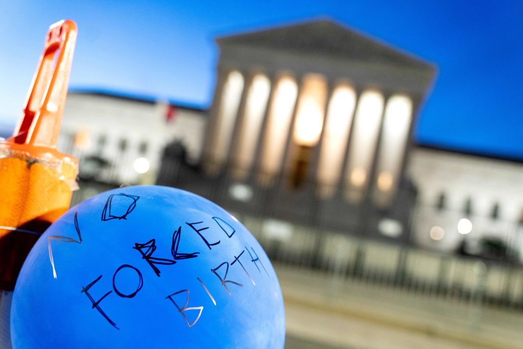 A balloon reading ‘No Forced Birth’ is displayed outside the U.S. Supreme Court on June 21, 2022. (Stefani Reynolds / AFP via Getty Images)