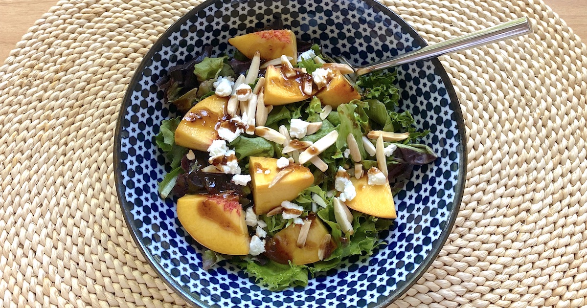 Earlier this summer, I had a big box of peaches from The Peach Truck that was begging to be enjoyed before they shriveled up and went bad. In need of a side for a pizza night with friends, I decided a stone fruit salad would be perfect for the occasion—and a great way to use my peaches. I added goat cheese for a bit of tang to play against the sweetness of the fruit, some slivered almonds for crunch, and balsamic dressing to bring it all together. After a quick toss in a salad bowl, it ended up being a hit.