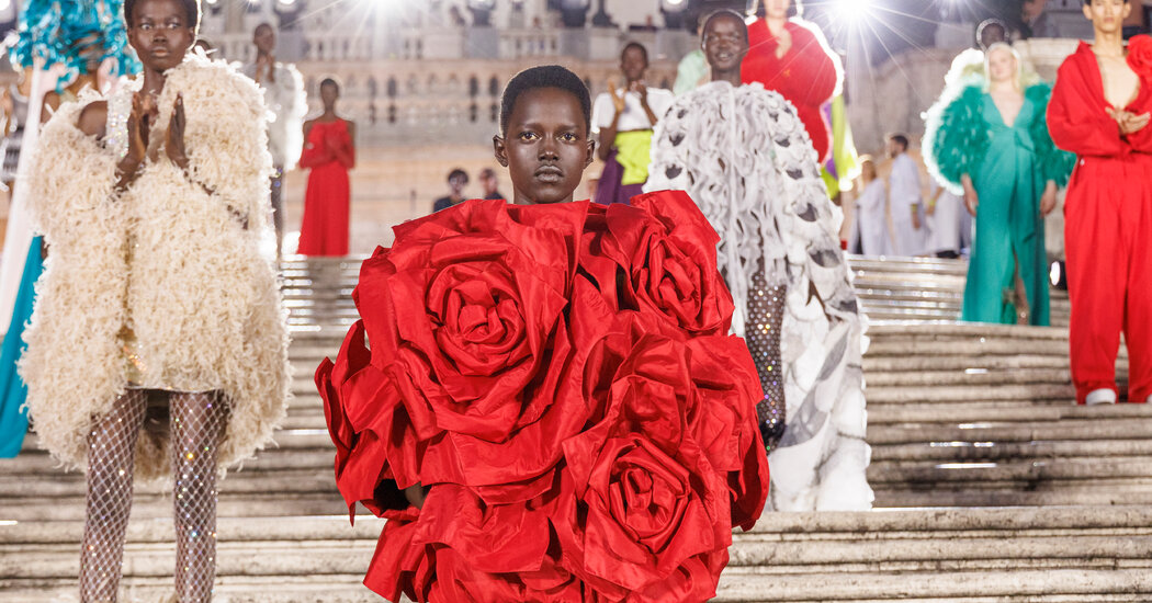 In a Rome nearing sunset, guests famous and otherwise milled around their seats taking selfies in a rainbow of Valentino plumage. Anne Hathaway tottered by in a fuchsia sequined minidress and towering platforms from the most recent ready-to-wear collection. Andrew Garfield was in a symphony of blue. One woman wore the lime green style that Melania Trump had worn to the final evening of the Republican National Convention in 2020. At the top of the steps, the Trinità dei Monti church practically glowed in the last of the evening light. Around the square, neighbors hung out of their windows to see what was going on.