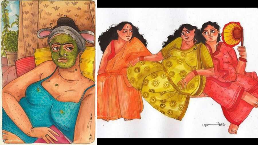 “Every Bengali or Kolkatan will relate to these. We’ve seen these men and women in our lives. They’re our mothers and aunts who traded stories while being their most authentic selves at home. They are the ‘Bangali chhele’ — boys and men we’ve grown up with and fallen in love with,” she adds.