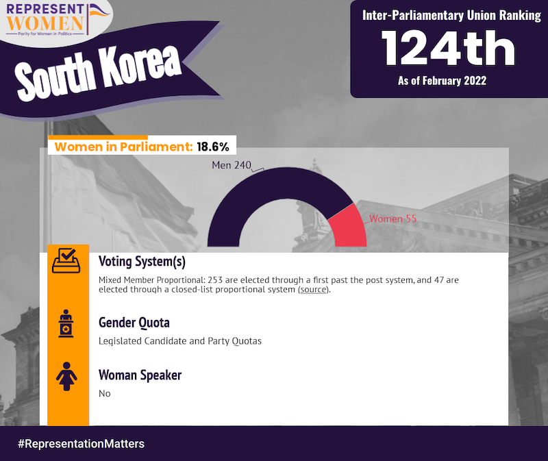 Women are underrepresented in politics in South Korea (read more about the details in this piece by former RepresentWomen intern Cameryn Chan) but this week’s election of an ultra-conservative may undermine women’s rights even further as this article in The Washington Post warns. And just as a reminder about the importance of ranked choice voting, the winning candidate received a plurality of the vote after a liberal and a progressive candidate split the majority vote — just like the 2000 presidential election in the United States: