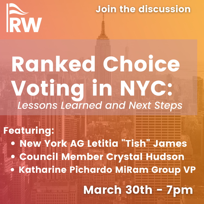 And if you’d like to learn more about how ranked choice voting is electing more women to office please join us on March 30th at 7pm to hear from NY Attorney General Tish James, NYC Council Member Crystal Hudson, MiRam Group VP Katharine Pichardo and others about this transformative reform!