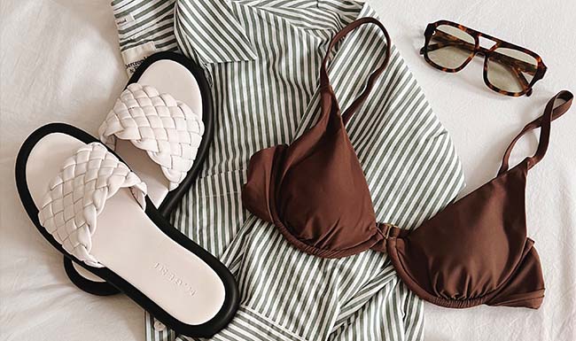 packable hat | shirt dress | one-piece bathing suit | slide sandals